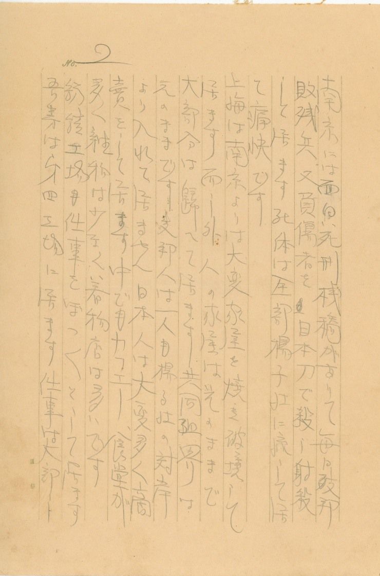 “南京有一座很有敬爱的死刑栈桥,每天都在用日本刀斩杀或射杀中国败残兵或伤兵,何况把尸体一王人抛入扬子江冲走,真昂扬”,这是侵华日军国崎支队步兵第四十一联队士兵村田芳夫于1938年1月8日写给父亲的信件,共4页,用铅笔书写,系缅思馆从日本学者渡边久志处搜集。