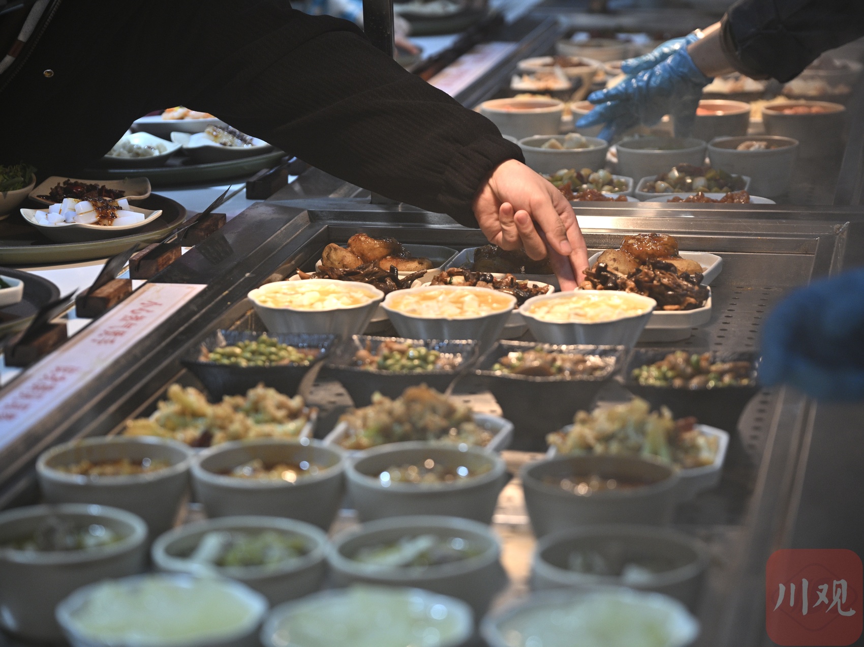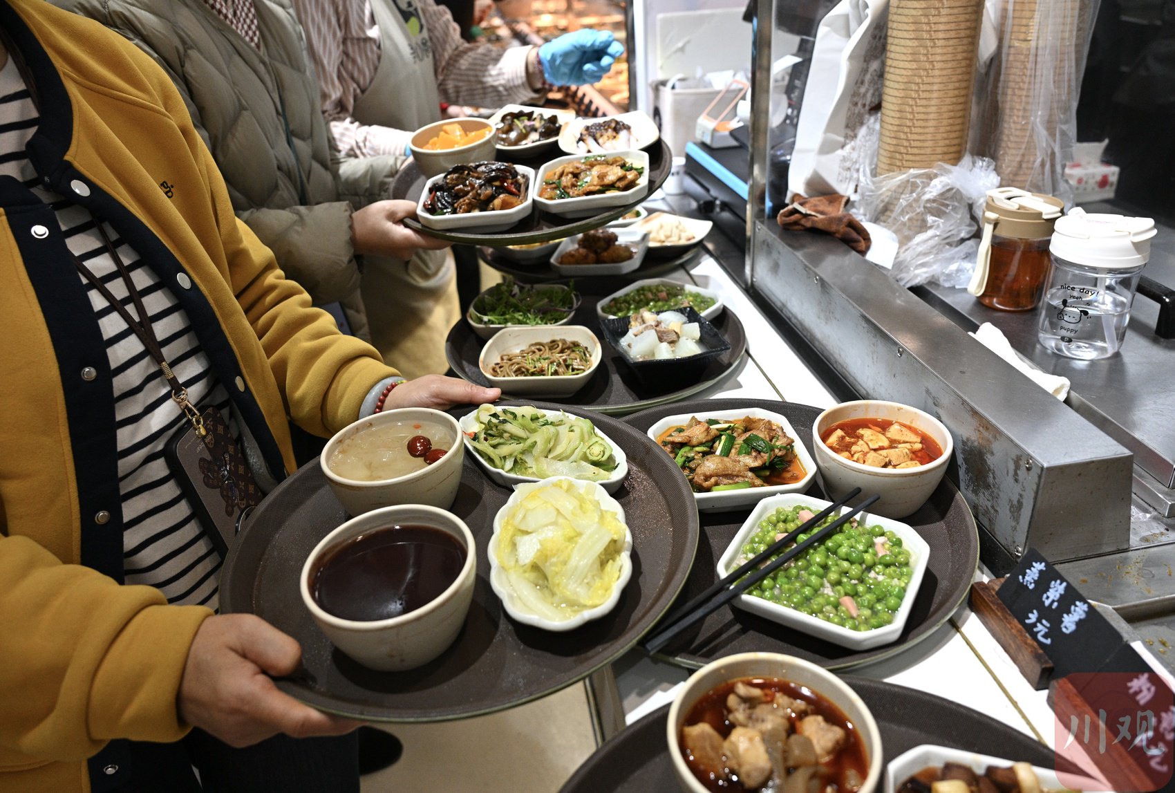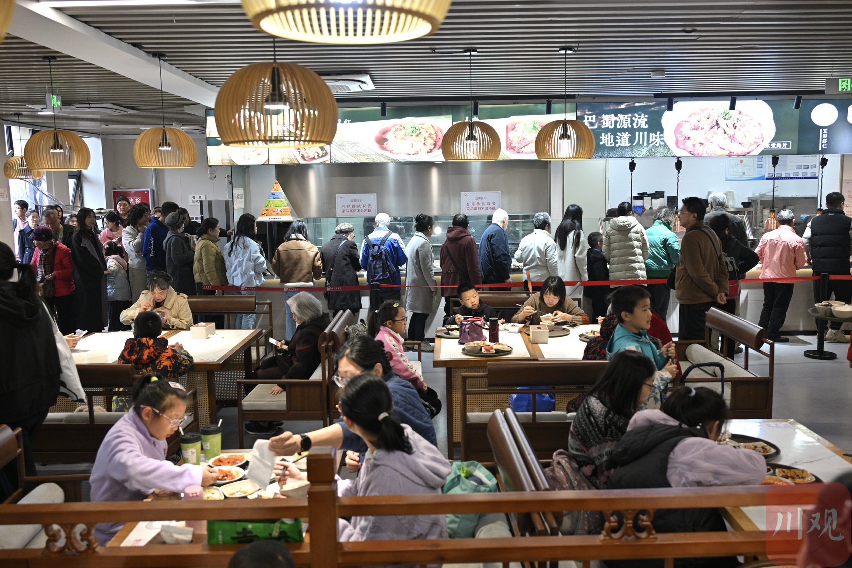 11月29日中午,四川博物院生计体验中心餐厅内东谈主头攒动,60余种小碗菜丰富多采。川北凉粉、麻婆豆腐、回锅肉等纯正川菜繁荣昌盛,招引搭客排起长龙。