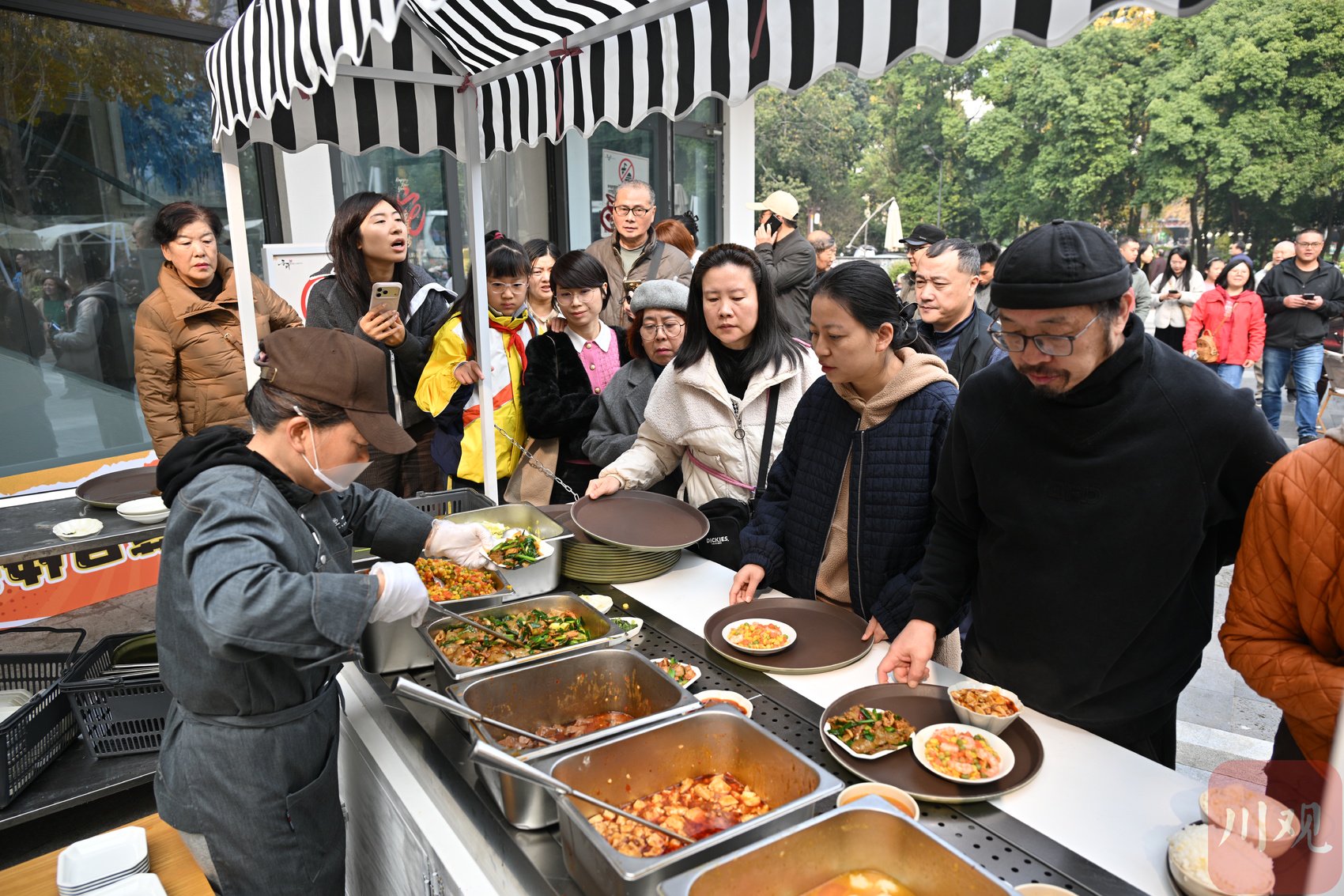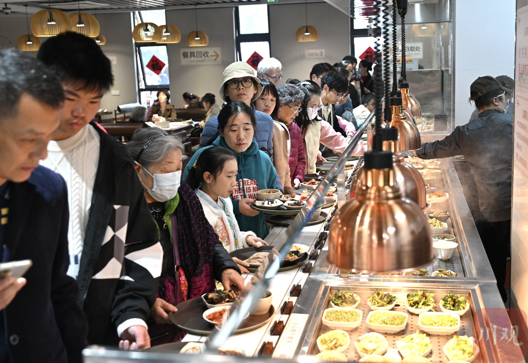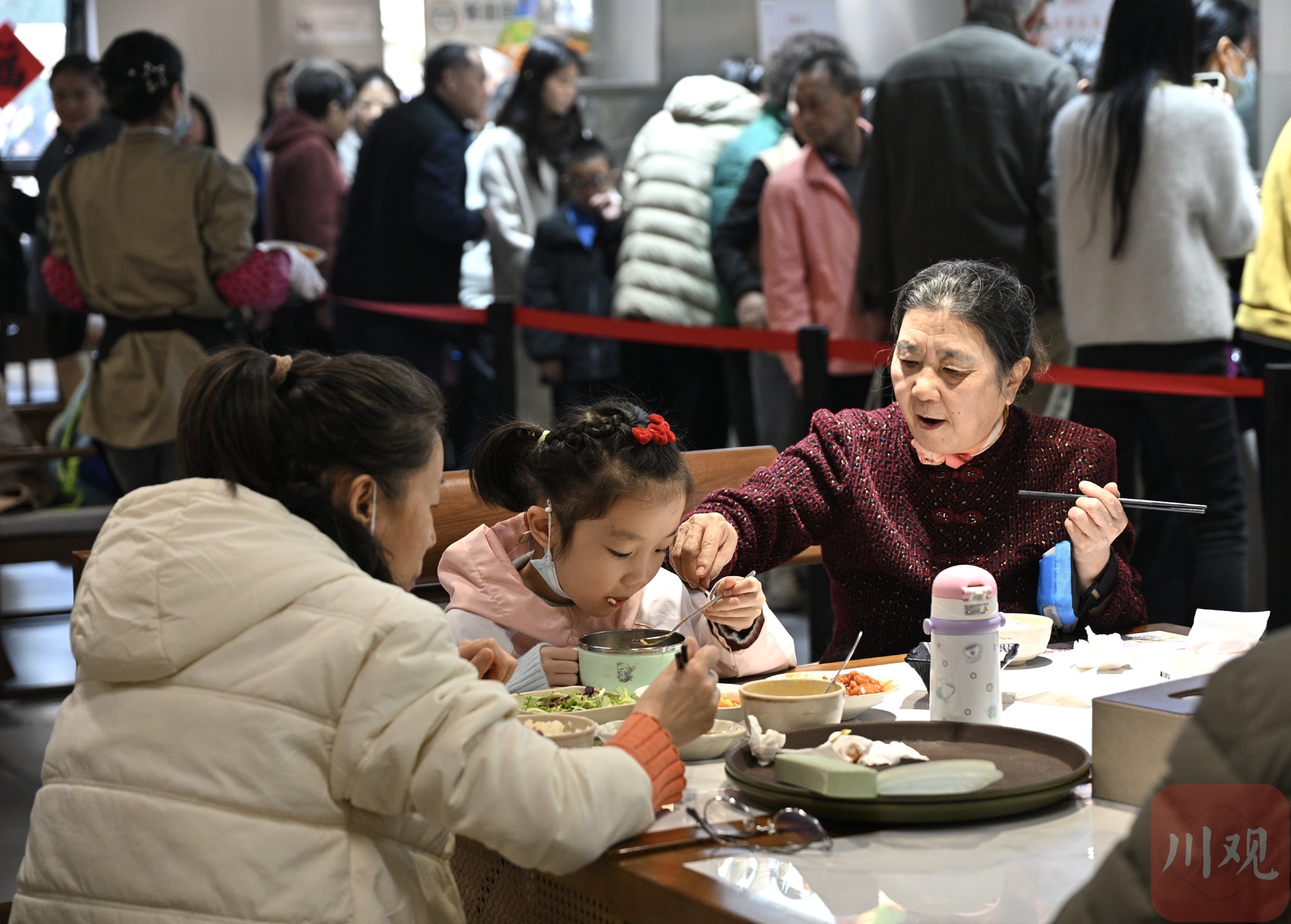 11月29日中午,四川博物院生计体验中心餐厅内东谈主头攒动,60余种小碗菜丰富多采。川北凉粉、麻婆豆腐、回锅肉等纯正川菜繁荣昌盛,招引搭客排起长龙。