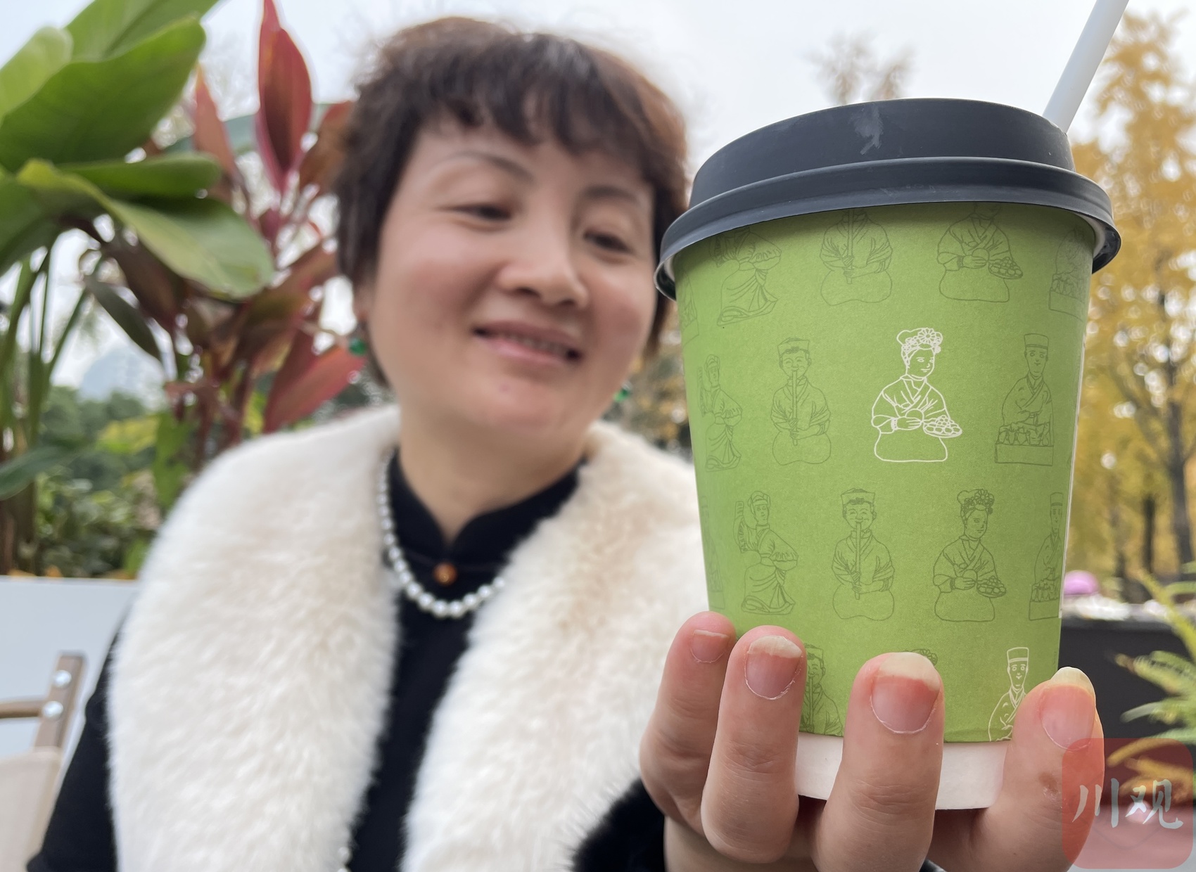 一位市民展示生计体验中心推出的文创咖啡杯。