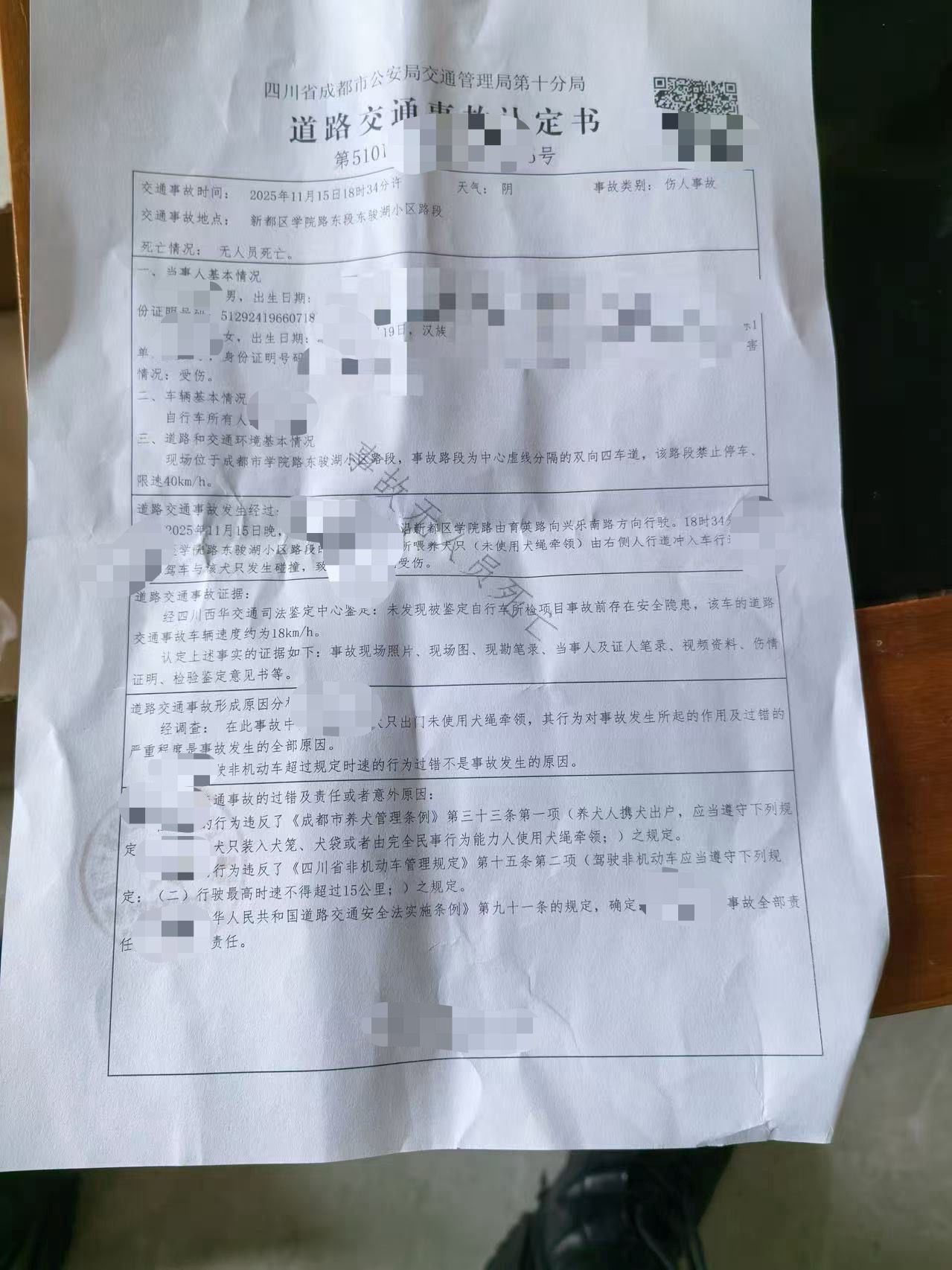 2025年11月15日晚上,新都区东骏湖景湾学院路东段隔邻,发生了全部交通事故:别称年青女生在骑行自行车时,被路边片刻窜出的未拴绳宠物狗绊倒,因未佩戴头盔,头部着地后流血不啻,并倒地不起一直抽搐。