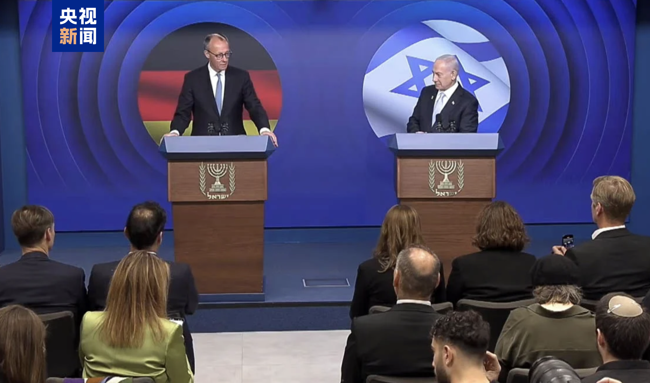 △德国总理默茨(左)与以色列总理内塔尼亚胡(右)在会谈后共同举行记者会