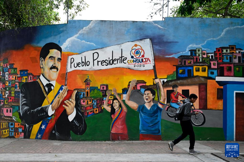 12月2日,在委内瑞拉齐门加拉加斯,行东谈主从复古委内瑞拉总统马杜罗的涂鸦墙前走过。新华社记者 李木子 摄
