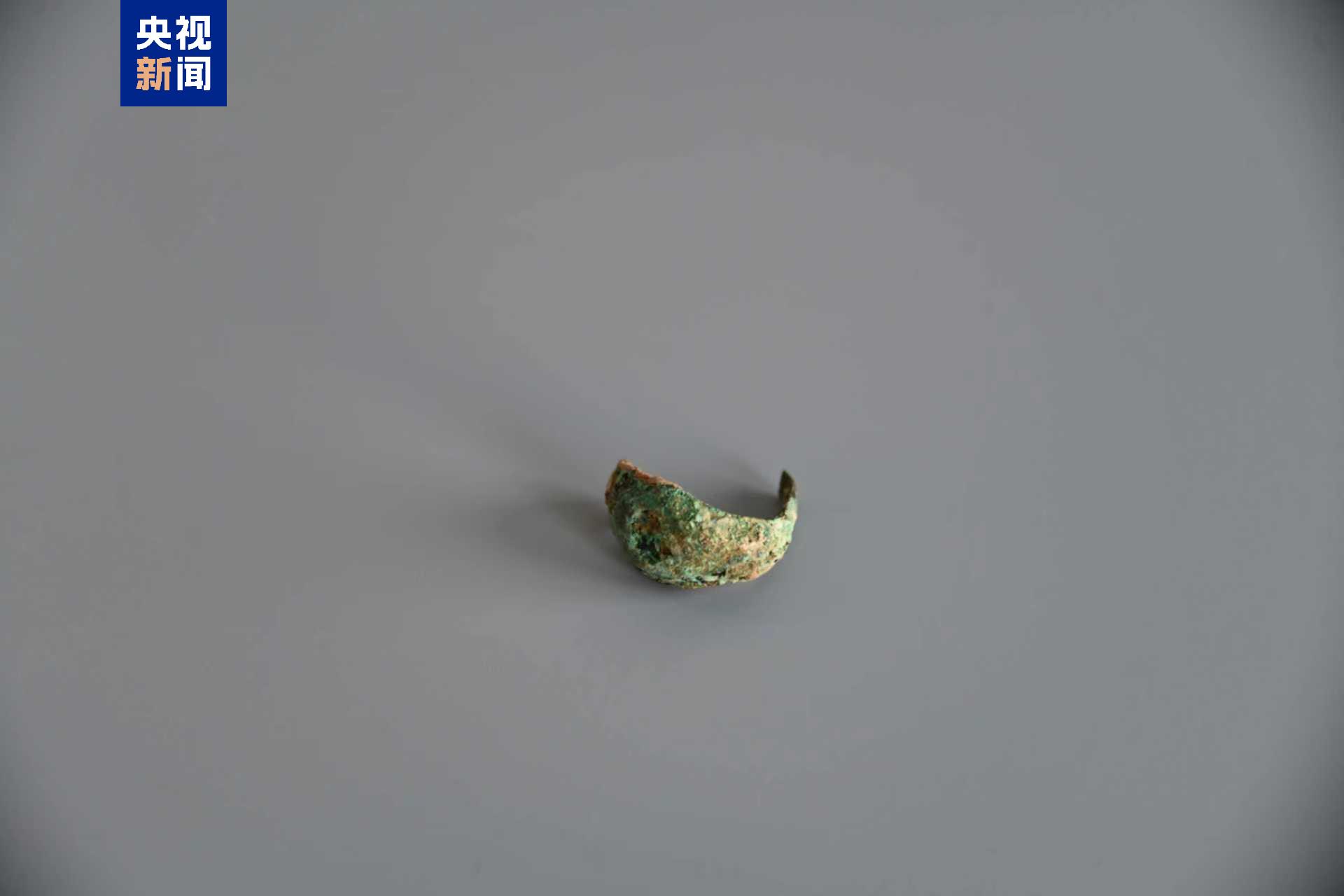 铜领域保存较差,锈蚀较严重,圈底一侧仍是残损,戒面较宽、有1.2厘米,径长约1.7厘米。