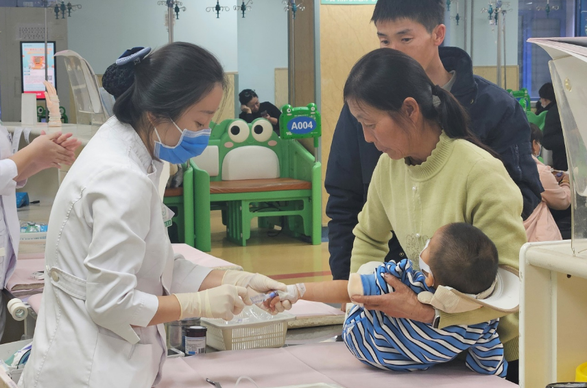 △北京儿童病院输液中心,守护为患儿打针。