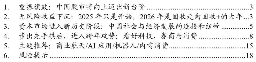 风风火火:中国股市将朝上迈出新台阶。11月24日上证指数跌至3800点悲不雅之际,国泰海通策略作出关键研判“要津位置:进入击球区,步出先手棋”,表态看好科技/券商/部分忽地。近期,中国股市驱动企稳反弹,12月5日券商/保障拉升,激活市集东谈主气。对后市,咱们以为在较万古期的横盘整理后,中国股市将进入跨年攻势,指数将朝上迈出新台阶:1)经济使命会议左右,2026年是十五五开局之年,经济日报金不雅平12月7日指出“宏不雅战略不可松劲,要以愈加积极有为的实招硬招,持续助力经济发展”,咱们预测广义赤字有望进一步膨胀,经济战略有望愈加积极。2)研究近期走弱的房地产销售面积,若好意思联储12月降息,当下东谈主民币踏实增值也为2026岁首中国宽松货币提供成心要求。3)国度金融监管总局下调保障公司权柄入市风险因子;继2014/2019/2024年后,证监会再度表态,纪律拓宽老本空间与杠杆上限;纠正提振中国市集风险偏好。12-2月是中国战略、流动性、基本面朝上共振的窗口期,咱们以为中国股市将渐渐张开跨年攻势,上升的空间还很大。