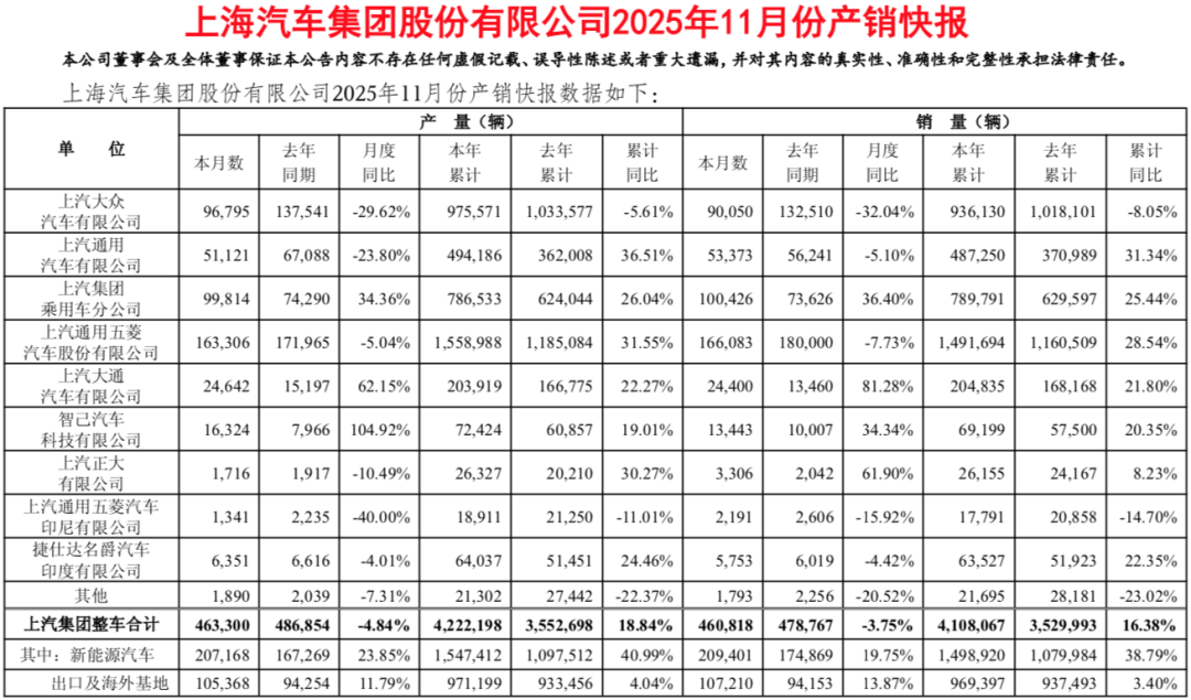 12月2日,上汽集团公布2025年11月以及2025年前11月销量快报。数据走漏,2025年11月,上汽集团整车打算销量为46.08万辆,同比下滑3.75%。其中,新动力汽车销量20.94万辆,同比增长19.75%;出口销量为10.72万辆,同比增长13.87%。2025年前11月,上汽集团累计销量为410.81万辆,同比增长16.38%。其中,新动力汽车累计销量为149.89万辆,同比增长38.79%;累计出口销量为96.94万辆,菲律宾修车群同比增长3.40%。