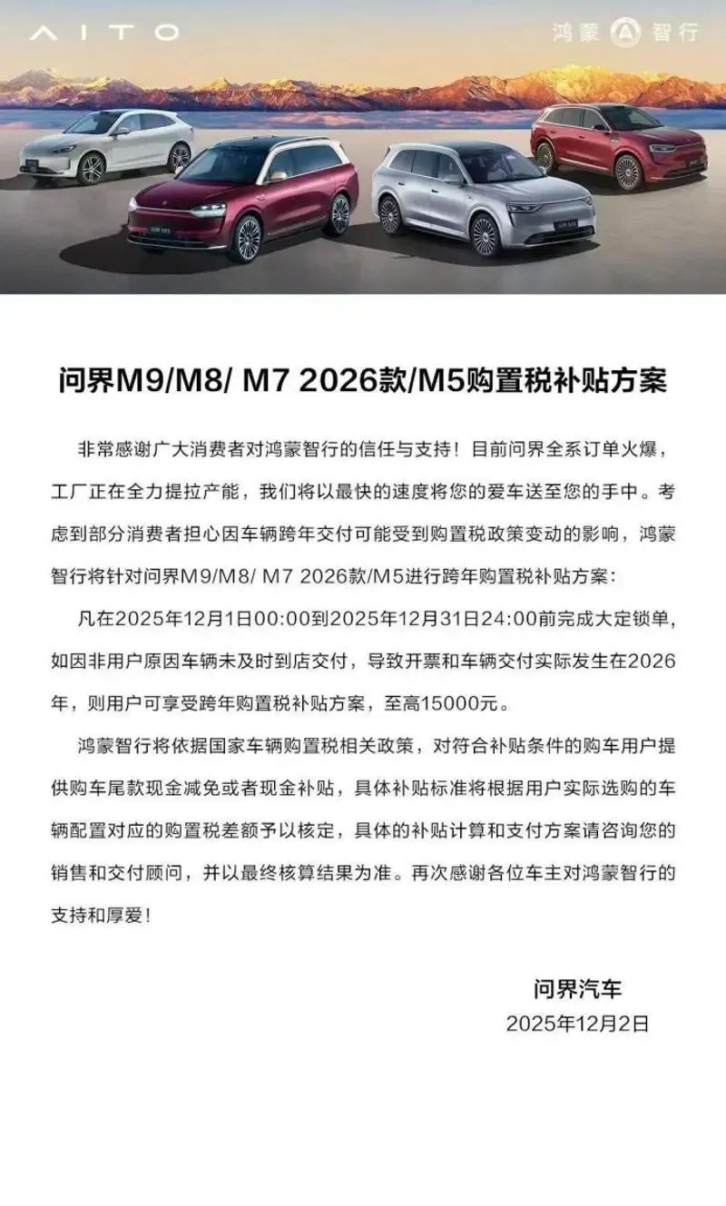 近日,问界汽车针对问界M9/问界M8/问界M7 2026款/问界M5推出了跨年购置税补贴决议:即日起至2025年12月31日24:00前完成大定锁单,如因非用户原因车辆未实时到店委派,导致开票和车辆委派内容发生在2026年,则用户可享受至高15000元跨年购置税补贴决议。该补贴将以购车尾款减免或现款补贴体式披发,具体补贴程序将笔据用户内容选购的车辆设置对应的购置税差额给予果断