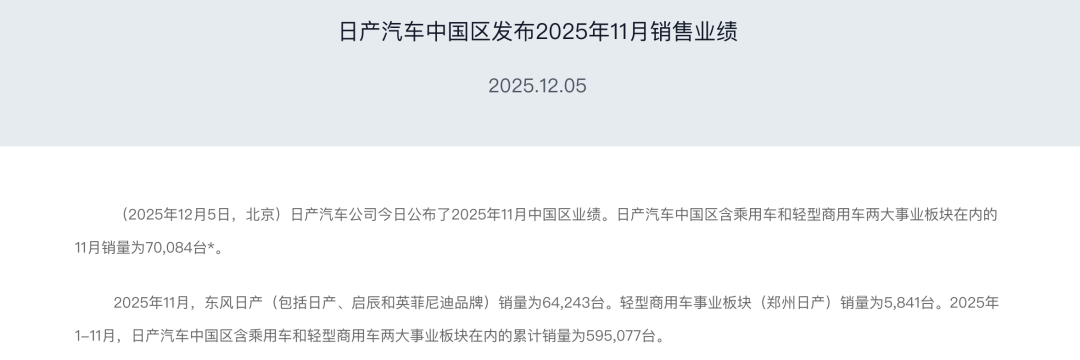 12月5日,日产汽车公布2025年11月中国区事迹。数据走漏,2025年11月日产汽车中国区含乘用车和轻型商用车两大行状板块在内的销量为70,084台,同比增长10.2%,其中东风日产(包括日产、启辰和英菲尼迪品牌)销量为64,243台,同比增长7.9%,郑州日产销量为5,841台,同比增长44.3%。
