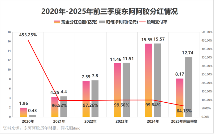 2020年至2024年,每年股利支付率均在96%以上,致使在2020年公司利润仅4328.93万元的情形下,仍分成1.96亿元,股利支付率高达453.25%。2020年至2025年前三季度,东阿阿胶累计分成48.98亿元,分成力度“近乎倾尽利润”。